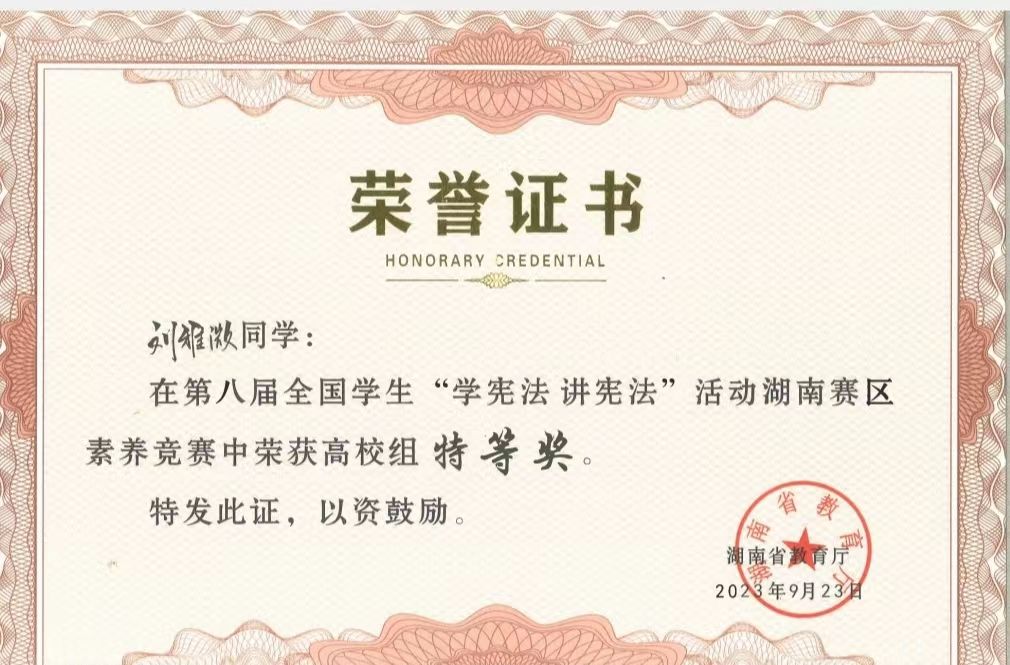 (通讯员 梁延喆 许华燕)近日,由湖南省教育厅主办的第八届全国学生“学宪法 讲宪法”活动湖南赛区总决赛在湘潭大学举行。决赛分为高校组、高中组、初中组以及小学组进行,我校法学院本科生刘雅溦同学荣获湖南赛区法治素养竞赛全省高校组特等奖,并将代表湖南省参加全国总决赛。