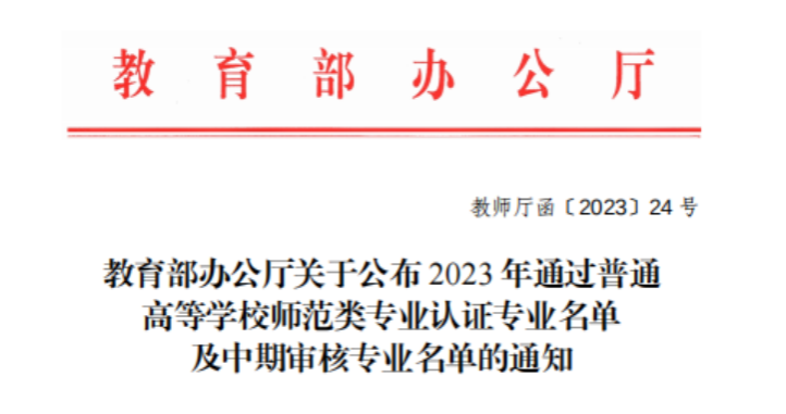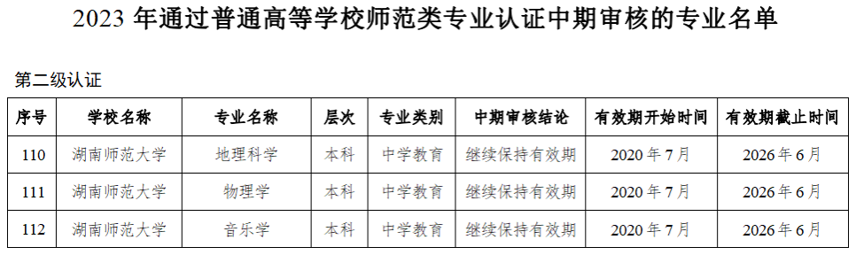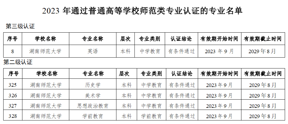 (供稿 教务处)近日,教育部公布了2023年通过普通高等学校师范类专业认证名单及通过中期审核专业名单,我校英语专业通过师范类第三级认证,成为全国首个通过第三级认证的英语专业,也是湖南省首个通过第三级认证的师范专业;历史学、美术学、思想政治教育、学前教育等4个专业通过师范类第二级认证,结论有效期6年;地理科学、音乐学、物理学等3个专业通过师范类专业认证中期审核。