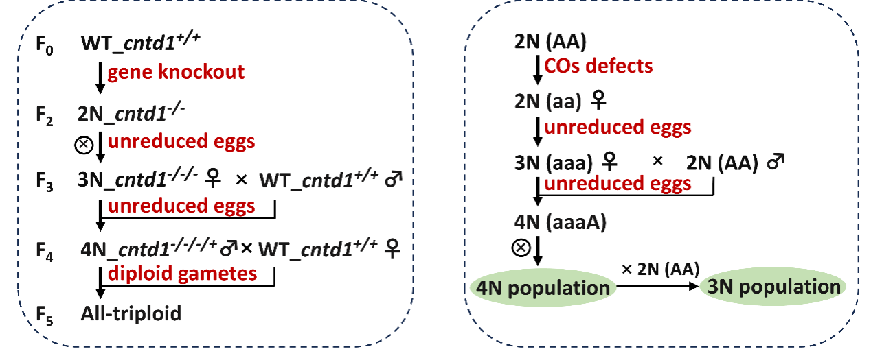左图:通过cntd1敲除构建四倍体品系及制备三倍体群体