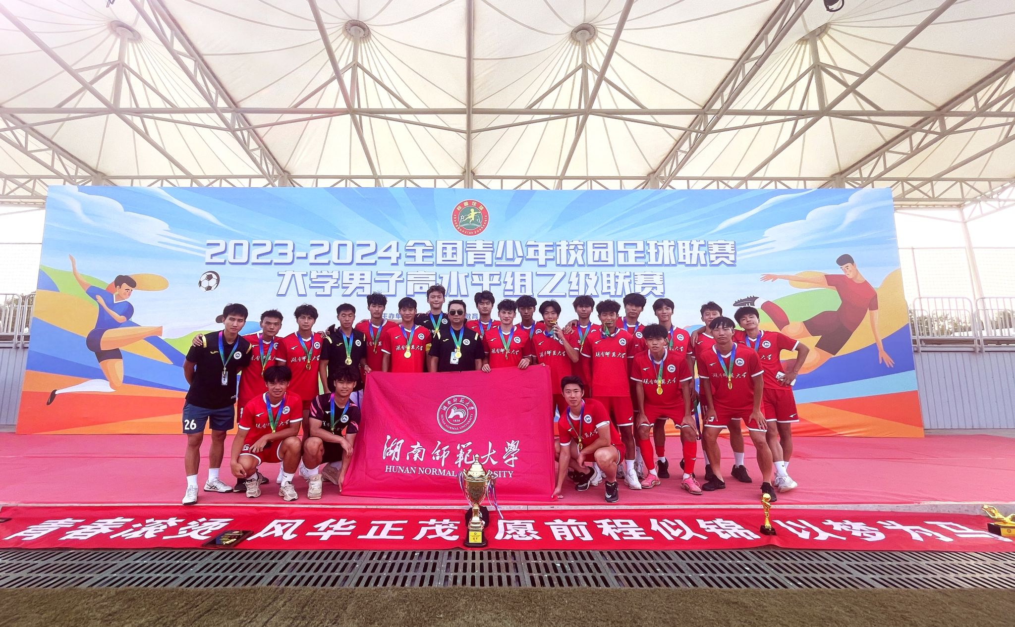 (供稿 体育学院)2023-2024全国青少年校园足球联赛大学男子高水平组乙级联赛在青岛白沙湾足球基地进行,参赛队伍由全国各省高校新科省级冠军近30支队伍参加,经过12天7轮比赛的激烈角逐,我校男子足球队以七战七胜、仅失一球的战绩,勇夺联赛总决赛“冠军”。