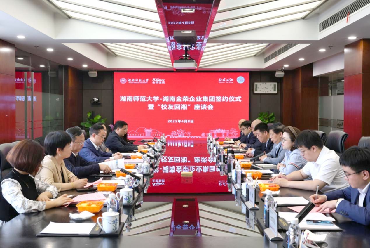 (供稿 科技处 记者 何子慧)4月8日,我校与湖南金荣企业集团有限公司签约仪式暨“校友回湘”座谈会举行。湖南金荣企业集团董事长李文金,我校校长、中国工程院院士刘仲华,副校长潘安练出席座谈会。