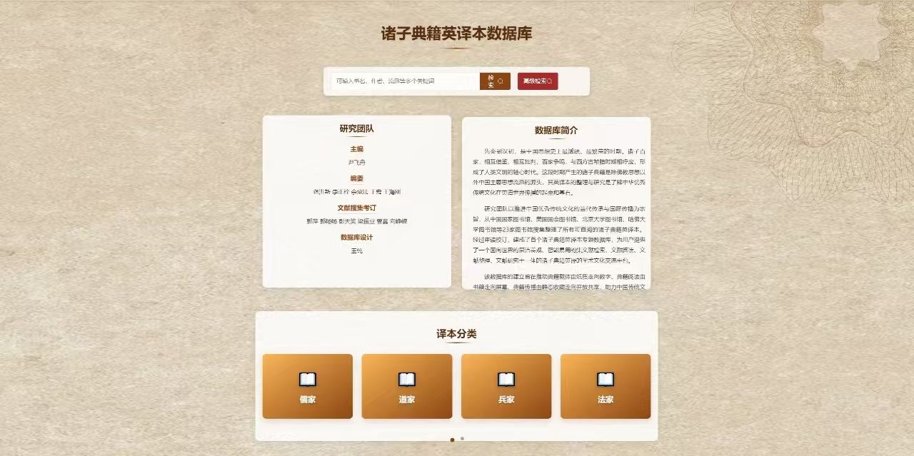 诸子典籍英译本数据库系尹飞舟主持的国家社会科学基金重大项目“诸子典籍英译传播文献整理与研究”(22&ZD291)的阶段性成果,为全球首个诸子典籍英译本专题数据库,由我校国家“双一流”学科——外国语言文学学科的跨学科研究平台——语言与文化研究院支持建设,旨在借力数字技术促进诸子典籍英译载体由纸质走向数字、诸子典籍英译阅读由书籍走向屏幕、诸子典籍英译传播由静态收藏走向互动共享,推动诸子文化更好地走入英语世界。该数据库具有文献检索、文献阅读、文献整理、文献服务和文献研究等5项功能,形成了“穷尽式搜集、滚动式整理、互动式服务”特色与范式,实现了“典籍+科技”深度融合,将助力诸子文化的广泛传播,促进中国典籍英译传播、国际汉学以及中西比较哲学研究的发展。