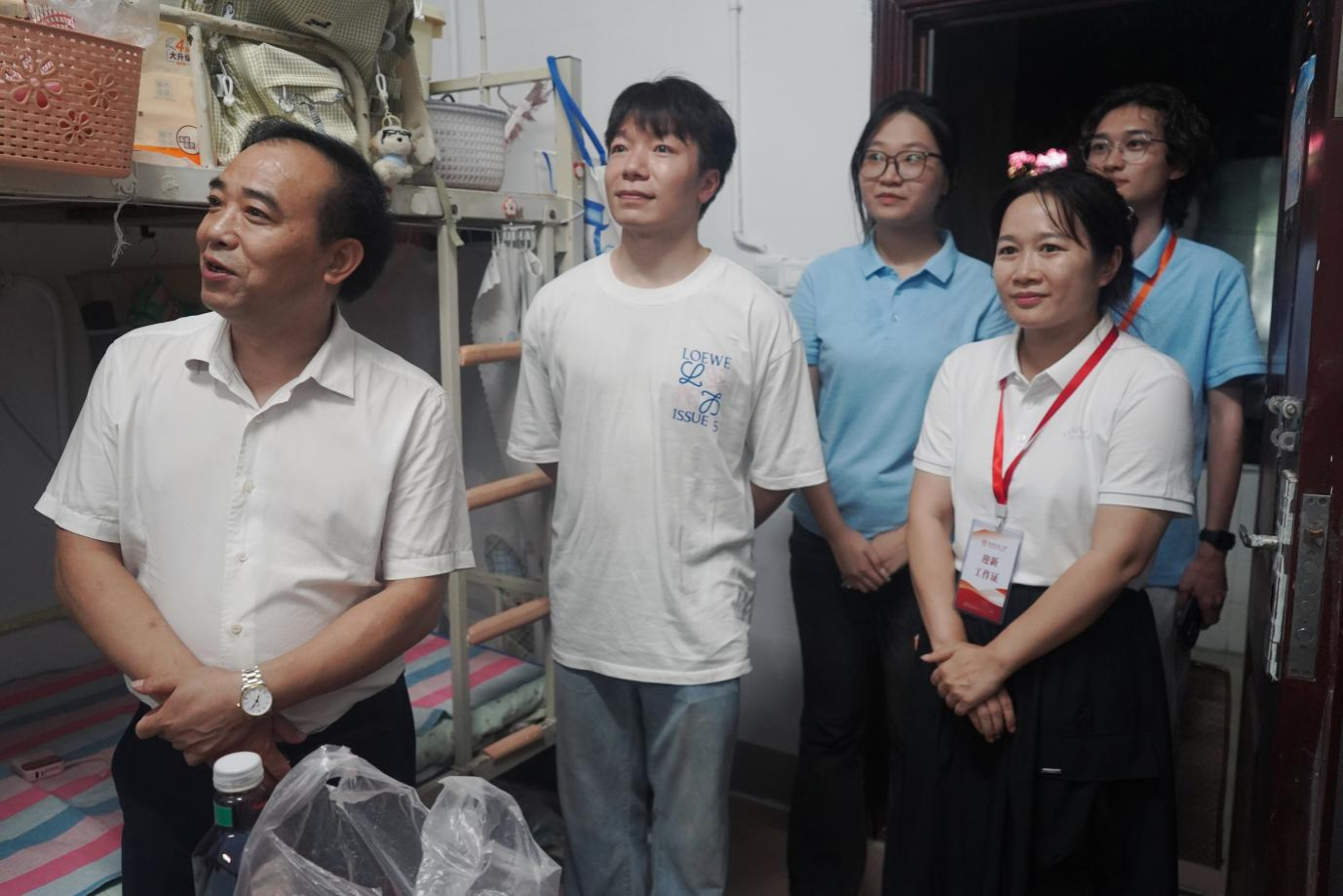 “宿舍住得习惯吗?食堂饭菜口味如何?”9月14日晚,学院党委书记王胜章带领院领导班子、系主任、班导师及学工办全体老师,分成5个小组深入新生宿舍走访。“住的地方安静,饭菜味道好!”张公岭校区1栋宿舍101室的6名女生几乎异口同声地回答。进入2栋宿舍302室,看到桌上摆放的入党申请书,王胜章当即与新生交流:“同学们今后从事的是党和人民的新闻事业,新闻工作者首先要站稳政治立场,厚植家国情怀,只有这样才能写出群众爱看的新闻作品。”他鼓励新生们在大学期间不仅要学好专业知识,更要筑牢思想根基,积极向党组织靠拢。