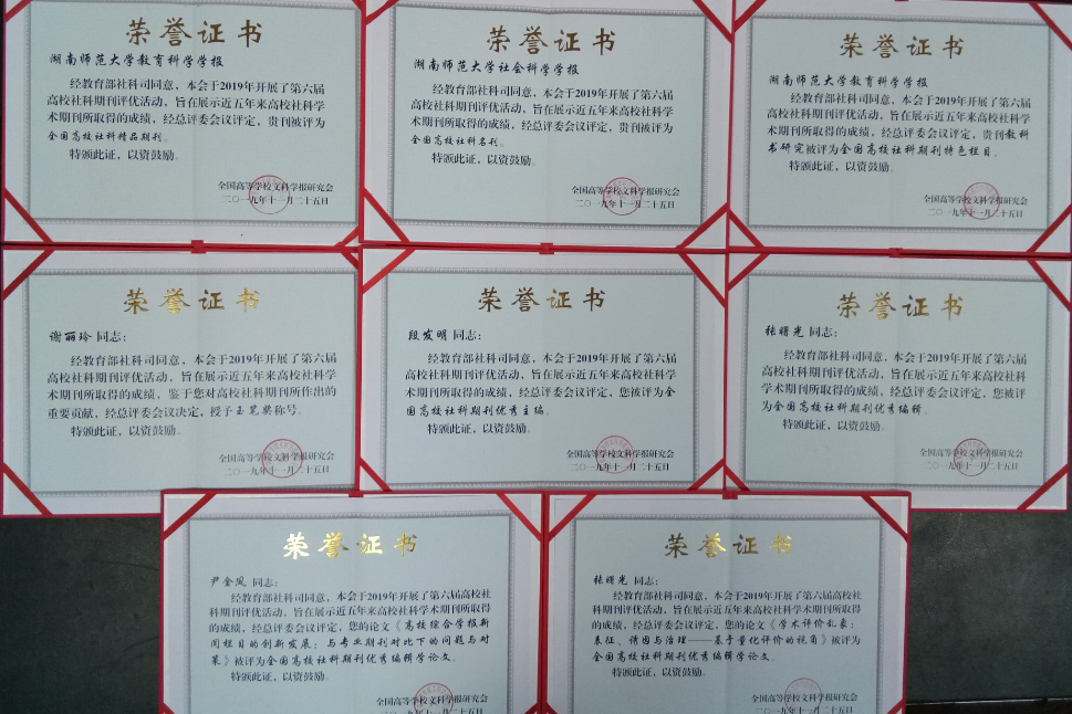 经教育部社科司同意,全国高等学校文科学报研究会于2019年4月至7月开展了第六届高校社科期刊评优活动。会上,我校《太阳网集团tcy8722社会科学学报》(以下简称社科学报)获评“全国高校社科名刊”;《太阳网集团tcy8722教育科学学报》(以下简称教科学报)获评“全国高校社科精品期刊”,“教科书研究”获评“全国高校社科期刊特色栏目”。教科学报执行主编段发明获评“全国高校社科期刊优秀主编”;教科学报谢丽玲被授予“玉笔奖”称号;教科学报张曙光获评“全国高校社科期刊优秀编辑”;社科学报尹金凤的论文《高校综合学报新闻栏目的创新发展:与专业期刊对比下的问题与对策》、教科学报张曙光的论文《学术评价乱象:表征、诱因与治理——基于量化评价的视角》被评为“全国高校社科期刊优秀编辑学论文”。