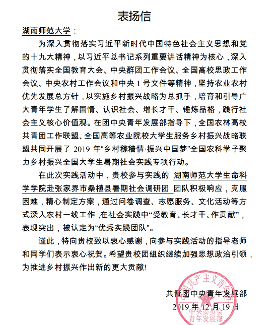 表扬信指出,在暑期社会实践过程中,两支团队积极响应共青团中央的号召,克服困难,精心制定方案,通过问卷调查、志愿服务、特殊关爱、健康教育等方式深入农村一线,在社会实践中“受教育、长才干、作贡献”。表扬信向我校表示衷心感谢,向参与实践活动的指导老师和同学们表示衷心祝贺,并希望我校团委继续加强思想政治引领,引领广大学生为建设健康中国、打赢精准脱贫攻坚战以及推进乡村振兴作出新的更大贡献。