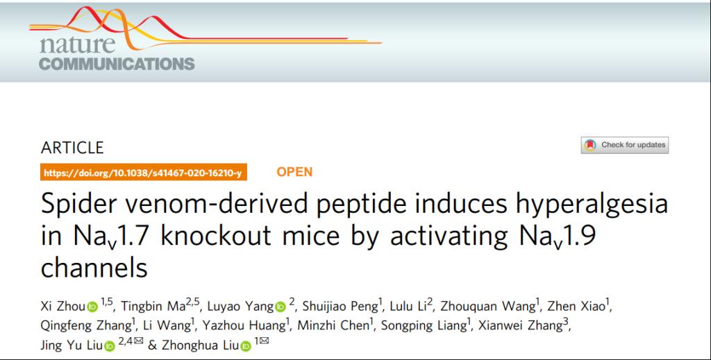 (通讯员 李云龙)5月8日,Nature子刊、校定SCI-TOP期刊《自然通讯》(Nature Communications)在线报道我校生命科学学院动物多肽药物创制国家地方联合工程实验室刘中华教授课题组与中国科学院脑科学与智能技术卓越创新中心(神经科学研究所)/华中科技大学生命科学与技术学院刘静宇教授课题组的合作研究论文Spider venom-derived peptide induces hyperalgesia in Nav1.7 knockout mice by activating Nav1.9 channels。