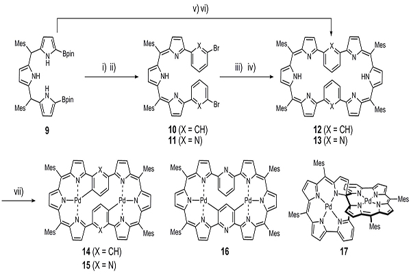扩环卟啉由于其丰富的光电性能、金属络合性能以及氧化还原性能受到了科学家们的广泛关注。基于该课题组前期的工作(Angew. Chem. Int. Ed.,2016, 55, 6438;Chem. Commun.2019,55, 11454)近期,该课题组以三吡咯烷-a,a'-二(频哪醇硼酸酯)9及间二溴苯/2,6-二溴吡啶为原料,利用Suzuki偶联的方法合成了苯掺杂、吡啶掺杂的八元扩环卟啉化合物(12/13)。12与醋酸钯作用只形成一种双侧插Pd产物14,而13可以与醋酸钯作用同时得到了双侧插钯产物15,单侧插钯产物16和螺环化合物17。15与16在三氟醋酸的作用下能够相互转化。研究表明吡啶杂环的引入,丰富了八元扩环卟啉类金属配位结构的多样性与可调控性,为新型分子开关的设计提供了新的思路。