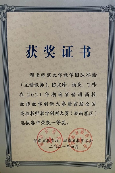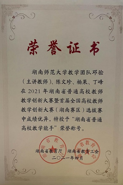 (供稿 马克思主义学院)近日,湖南省教育厅和省教育工会公布了2021年湖南省普通高校教师教学创新大赛暨首届全国高校教师教学创新大赛(湖南赛区)选拔赛结果。我校马克思主义学院教学团队邓验(主讲教师)、陈文珍、杨果、丁峰荣获一等奖,并被授予“湖南省普通高校教学能手”荣誉称号。