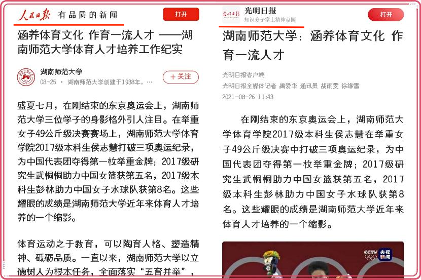 (记者 董飞 通讯员 徐缘雪 孙雨欣)今年的东京奥运会上,我校三位学子的出色表现得到了媒体的广泛关注,人民日报、光明日报、新华网、中国教育在线、学习强国、湖南广电、红网时刻、湘微教育等十多家中央、省级主流媒体对我校体育人才培养工作进行了集中报道,网易新闻、今日头条等各大媒体纷纷转发。这充分展现了我校努力构建德智体美劳全面培养的教育体系,以及涵养校园体育文化、不断培育优质人才的教育追求。