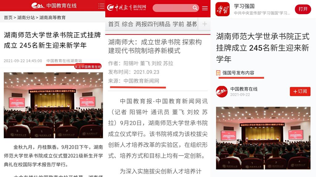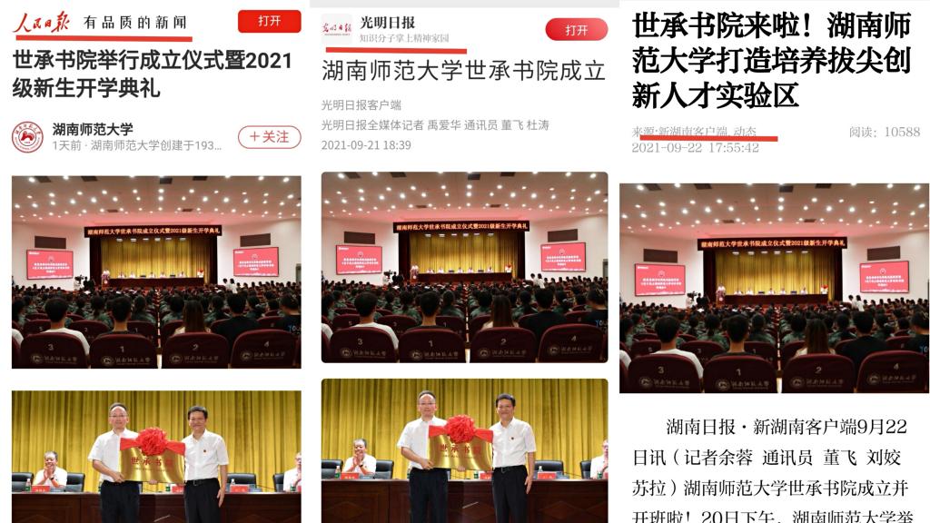 (通讯员 郭昕茗)9月20日,我校世承书院成立仪式暨2021级新生开学典礼于国际学术报告厅举行。作为集全校之力、聚全校之智建设的拔尖创新人才培养模式改革特区,世承书院受到了媒体的广泛关注。人民日报、光明日报、湖南经视、中国教育新闻网、学习强国、湖南教育新闻网、湖南日报、红网等多家中央、省级主流媒体,对我校现代书院制拔尖创新人才培养新模式进行了集中报道,中国教育在线、网易新闻、今日头条等网络媒体纷纷转发。世承书院的创立,充分展现出我校主动对接国家重大战略、深入实施拔尖创新人才培养计划、不断完善拔尖创新人才培养新体系的教育追求。