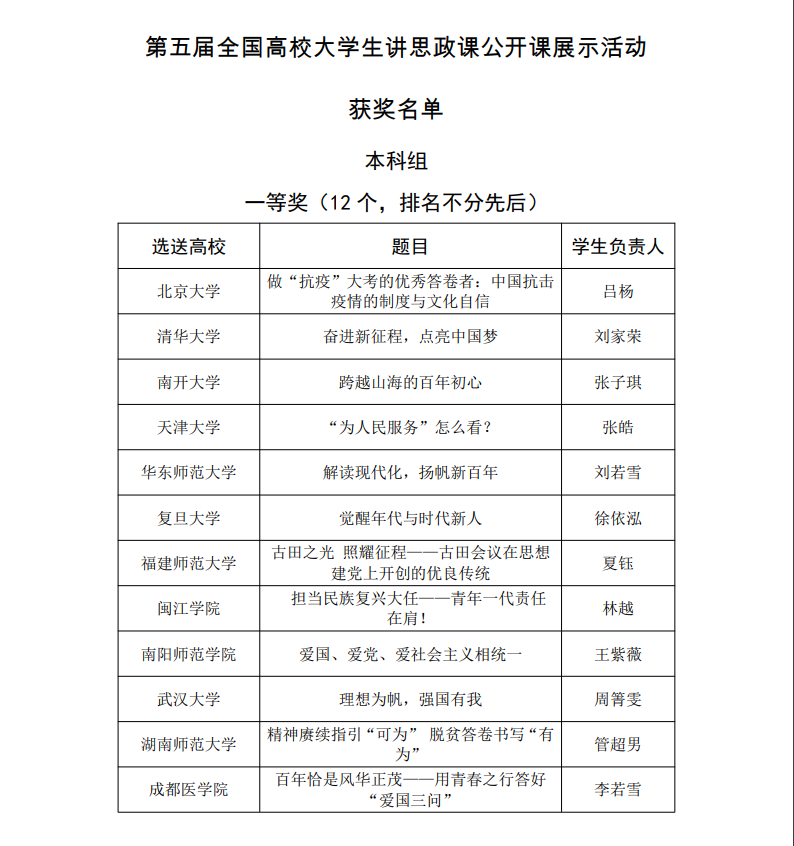 (供稿 马克思主义学院)近日,由教育部高校思想政治理论课教学指导委员会主办、南开大学马克思主义学院承办的“第五届全国高校大学生讲思政课公开课展示活动”评选结果揭晓。经过专家多轮评审,我校马克思主义学院硕士研究生管超男主讲,张茜、贺茶湘、禹凤、高海、王紫薇参与,邓验老师指导的参赛作品——《精神赓续指引“可为” 脱贫答卷书写“有为”》荣获一等奖。