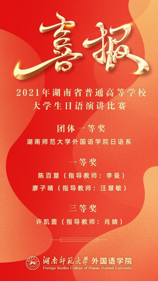 (通讯员 肖婧)由湖南省教育厅主办、湖南省高等教育学会日语专业委员会协办,湖南财政经济学院承办的2021年湖南省普通高等学校大学生日语演讲比赛于12月12日在湖南财政经济学院举行。来自全省18所高校日语专业的53名选手展开了激烈角逐,我校外国语学院日语系2018级学生陈百慧(指导老师:李曼)和2019级学生廖子晴(指导老师:汪慧敏)分别以组别第一名的成绩获得一等奖,2020级学生许凯茵(指导老师:肖婧)获三等奖。我校日语系荣获团体一等奖。