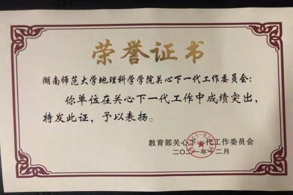 地理科学学院关工委连续3年在湖南省教育厅关工委主题教育活动中获得“优秀作品”奖;2019年由陈媛老师指导、学生撰写的《冰川之子》获评教育部关工委“读懂中国”活动“最佳征文”,2020年由学院主创的《地理学家的小康梦》再获评教育部关工委“读懂中国”活动“最佳微视频”奖,并先后在中国教育电视台一套(CETV1)、湖南教育电视台、湖南广播电台等新闻媒体展播。