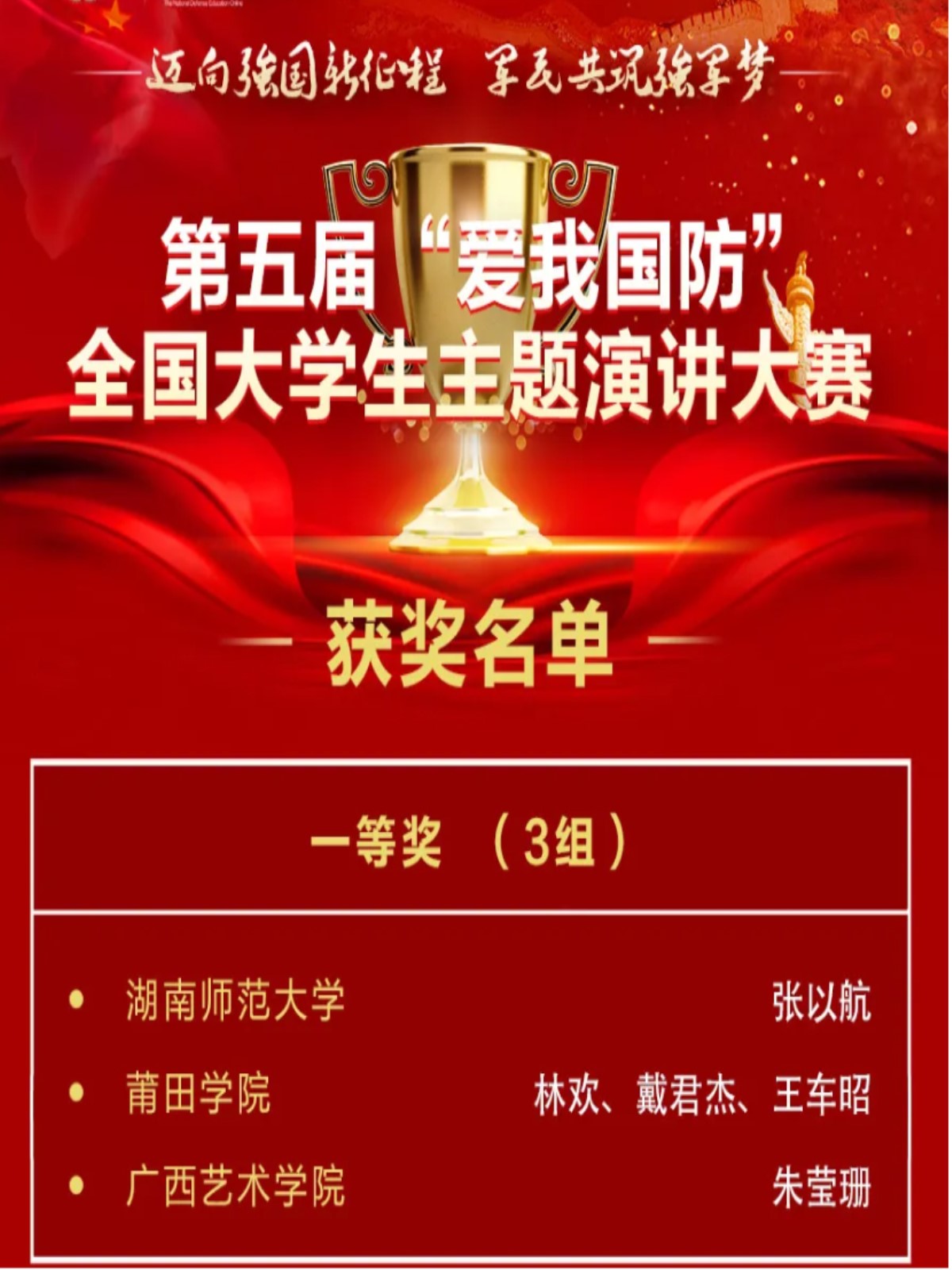 “爱我国防”全国大学生演讲大赛由中共中央宣传部、国家国防教育办公室、中央网络安全和信息化领导小组办公室、中华人民共和国教育部等相关部委联合举办。此次大赛以“迈向强国新征程,军民共筑强军梦”为主题,自启动以来得到了我校党委宣传部、学生工作部(处)、武装部、新闻与传播学院、国际汉语文化学院等单位的高度重视和通力配合。