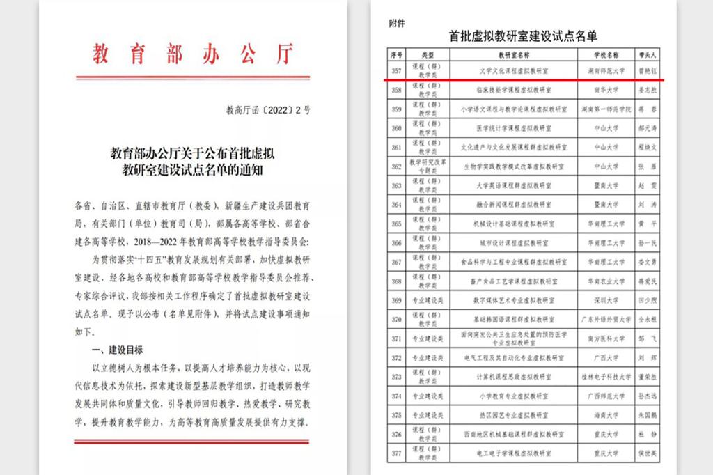 (供稿 外国语学院)2月22日,教育部发布通知公布首批教育部虚拟教研室建设试点名单,我校外国语学院曾艳钰教授牵头的文学文化课程虚拟教研室获批入选。