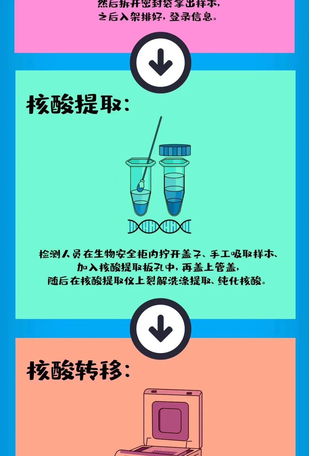 对于大家来说,核酸检测看似只有两步:登记采样,等待数小时后在健康码上查询结果。事实上,在这看似轻松的两步背后,还凝聚了基因扩增实验室(PCR实验室)检验人员的大量工作。一份核酸报告的诞生要经历采样、标本转运、标本签收、核酸提取、核酸转移、核酸扩增、结果审核……详见↓
