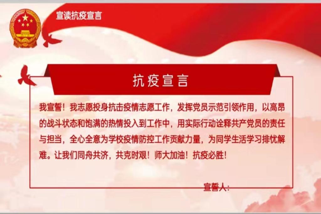 为发扬党员的先锋模范带头作用,夏禹老师于3月30日策划并组织了线下、线上同步的党员宣誓活动,带领同学们为学校的防疫工作贡献了自己的一份力量。