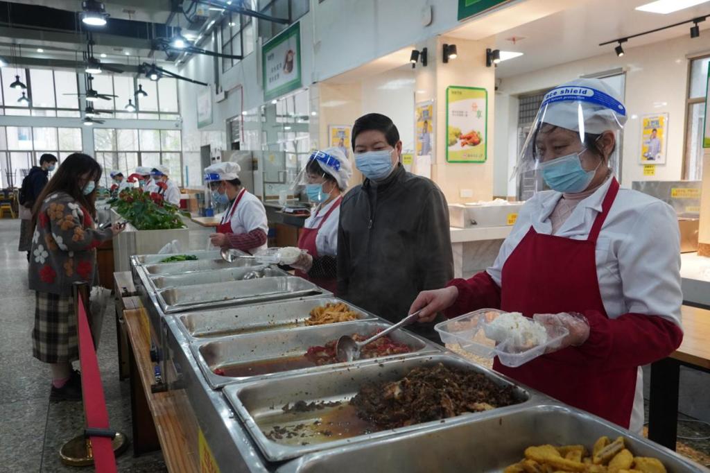 各食堂每日严格工作人员的日检日测,严格师生进出食堂“扫码取餐”,全方位无死角清洁消毒,定时开窗通风。在加大就餐场所及操作间消毒频次的基础上,根据目前就餐状况不断细化操作流程,努力保障膳食搭配营养均衡,并加强对食堂生产制作、窗口售卖、菜肴留样等各环节监督检查。同时,派工作人员做好现场解释工作,并对没有及时就餐的师生提供送餐服务,最大可能确保师生吃饱吃好。