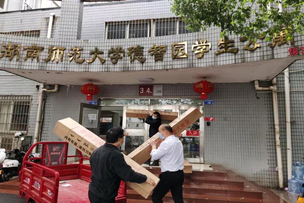 深夜,在处长黄智勇、党委书记陈文雄带领下,处机关、各中心积极联系供应商,以最快速度抢运紧缺防护和生活物资。外面车辆进不来,就派人用三轮车拖,用手提,用肩扛,第一时间派送到各个战位。工作安排就绪后,陈文雄说:“疫情就是命令,我们就要与时间赛跑,手上多一份物资,师生就多一份保障,干到天亮也没事儿。”