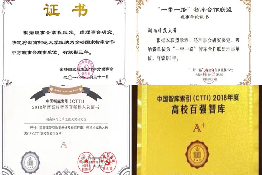 学校作为湖南省首批7家省级重点智库之一,先后入选中联部“金砖国家智库合作中方理事会”“一带一路智库合作联盟理事会”成员单位;学校智库整体进入CTTI中国大学智库前50强,3家智库研究机构获批教育部国别与区域研究备案中心,3家智库研究机构入选湖南省专业特色智库,6家智库研究机构成为中国智库索引CTTI来源单位。道德文化研究院获评国家首批省部共建协同创新中心,获“中国智库最佳管理奖”,获评“中国智库索引高校智库百强榜”A+级智库,位列全国前25强,在全国文化与教育领域智库排名中位列全国第8位。