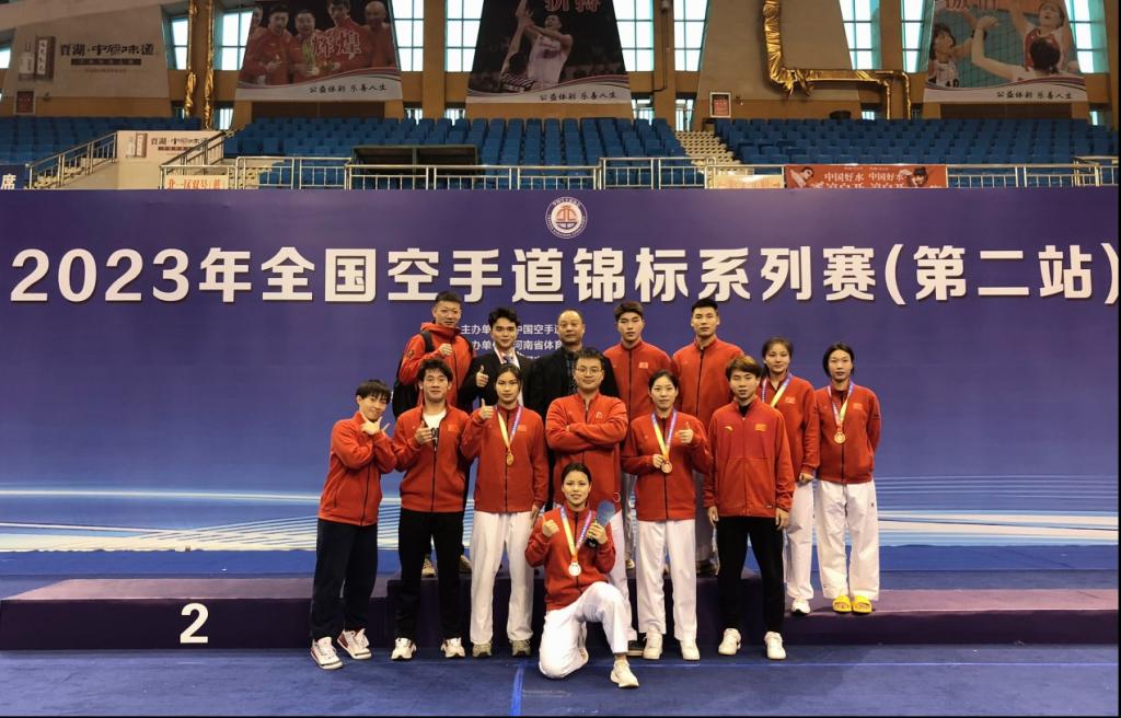 本次省空手道队由体育学院郭建平教授带领,坚持科学高效训练,探索专业训练与人才培养新模式,成为了我国竞技体育体教融合创新发展的成功范例。自2018年我校与湖南省体育局共建湖南省空手道队以来,省空手道队由我校负责组织队伍的训练和管理,多次参加全运会、全国锦标赛、全国青少年比赛及全国大学生锦标赛等专业比赛,屡次战胜强队,斩获佳绩。龚淼琪、查雯红2人入选国家队,备战杭州亚运会。