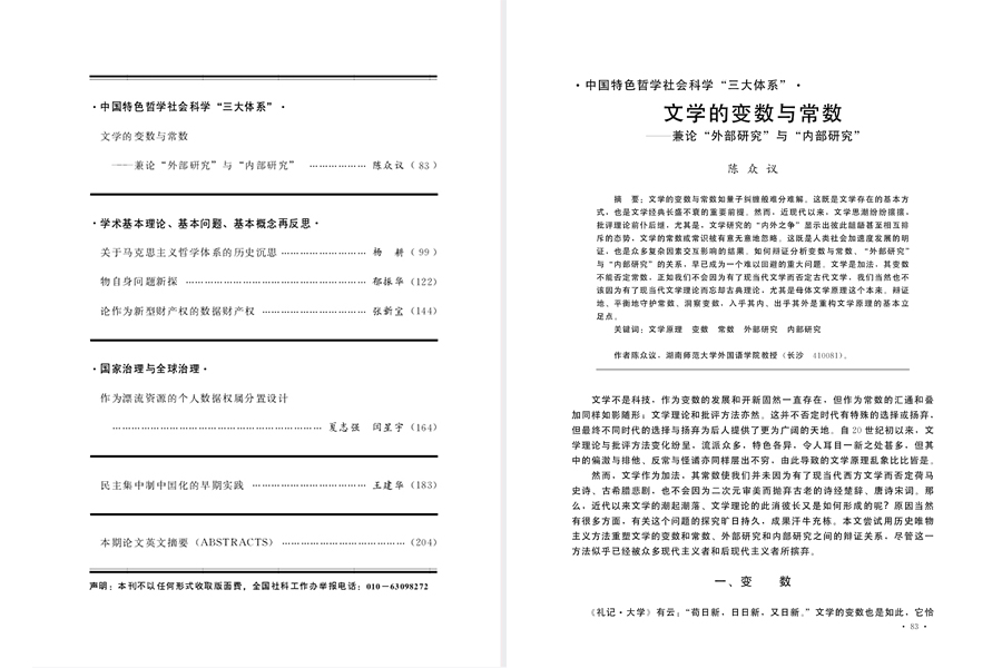 《中国社会科学》是中国社会科学院主管并主办的综合性哲学社会科学期刊,主要发表哲学社会科学前沿研究成果,被学术界誉为中国最高水平的综合类人文社会科学顶级期刊。陈众议教授的论文,发表在《中国社会科学》“中国特色哲学社会科学‘三大体系’”专栏上,为加快构建中国特色哲学社会科学,作出了重要的理论贡献。