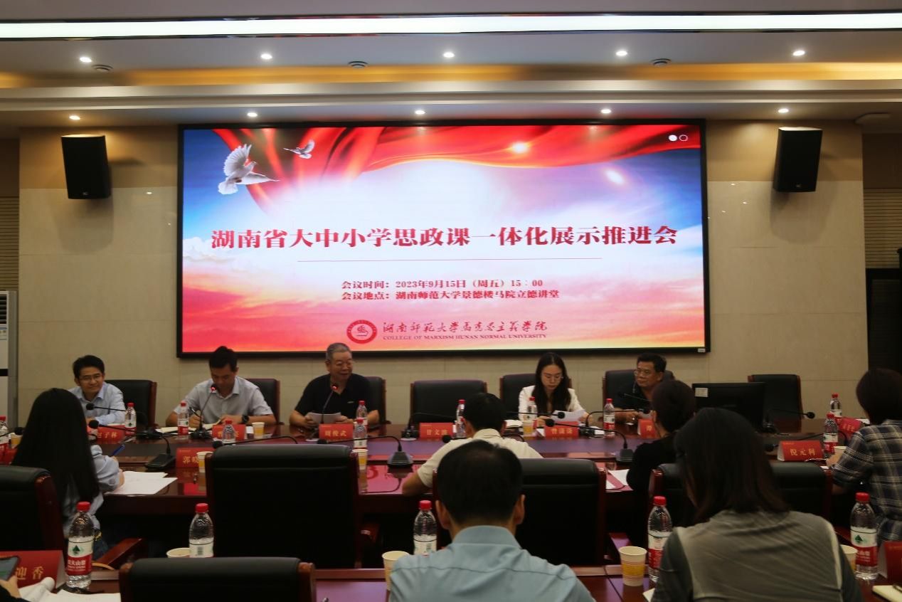 (记者 刘曦妍 李影)9月15日下午,湖南省大中小学思政课一体化展示单元活动工作推进会在我校景德楼召开。会议由省教育厅思政处副处长曾思亮主持。我校党委副书记周俊武出席会议。