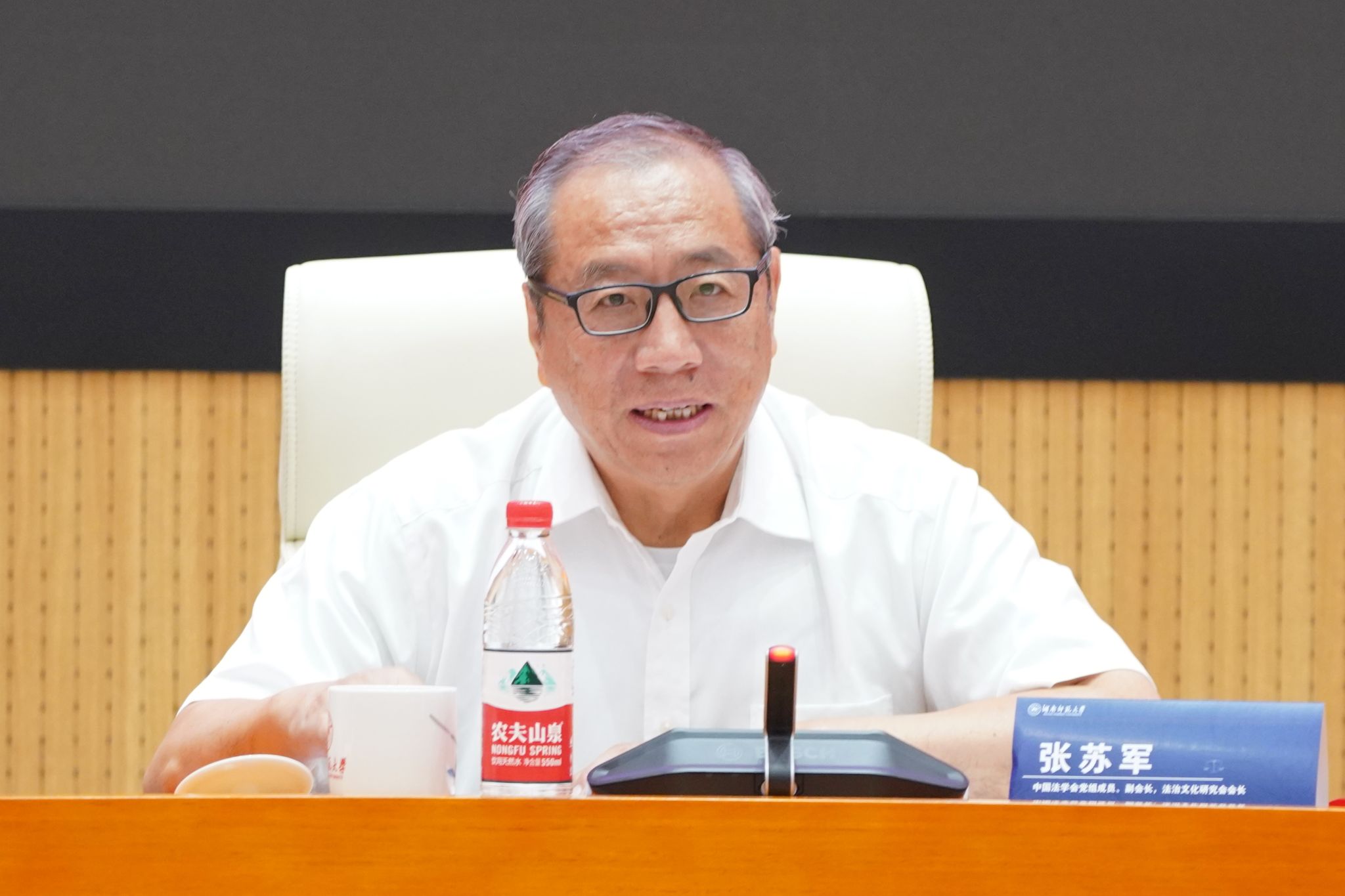(供稿 法学院)9月16日,中国法学会法治文化研究会年会暨“法治文化理论与实践”研讨会在我校召开。中国法学会党组成员、副会长,法治文化研究会会长张苏军出席会议。我校党委书记、欧洲科学院院士蒋洪新致辞。中国法学会研究部二级巡视员王伟国宣读中国法学会党组相关批复。中国法学会法治文化研究会常务副会长兼秘书长周占华主持会议。