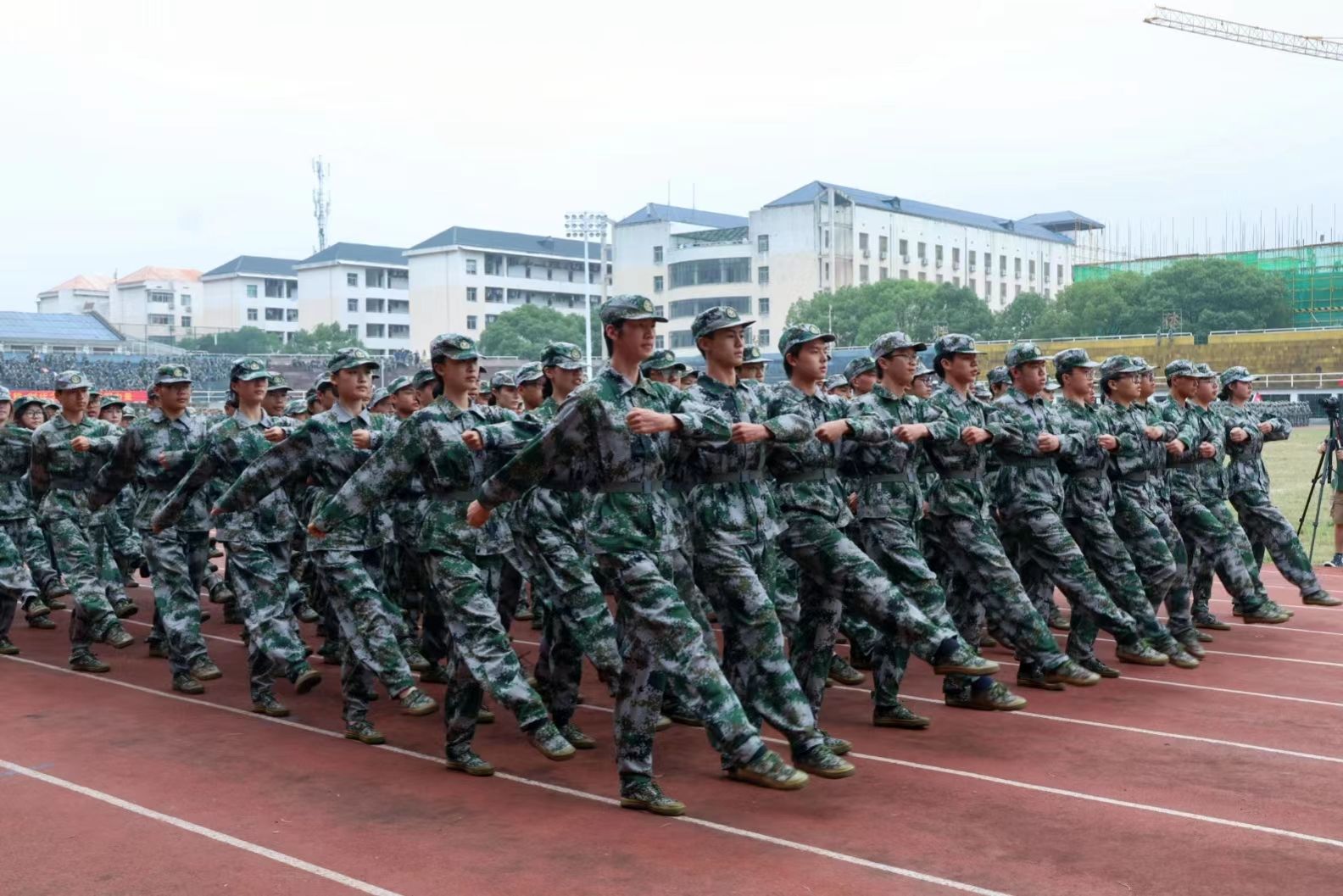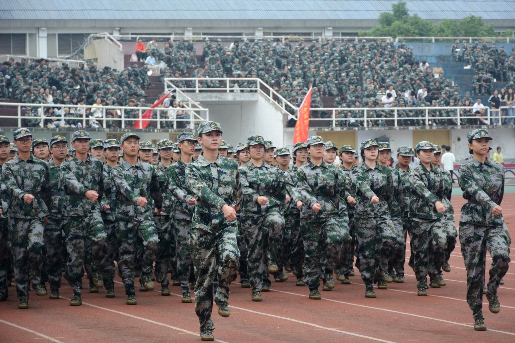 军训成果汇报仪式由女子国旗护卫队大队长、体育学院曾荟珍同学指挥,随着分列式进行曲响起,标兵就位,在引导员的引领之下,各学院方阵迈着坚定的步伐,喊着嘹亮的口号,依次踏正步走过主席台前接受检阅。