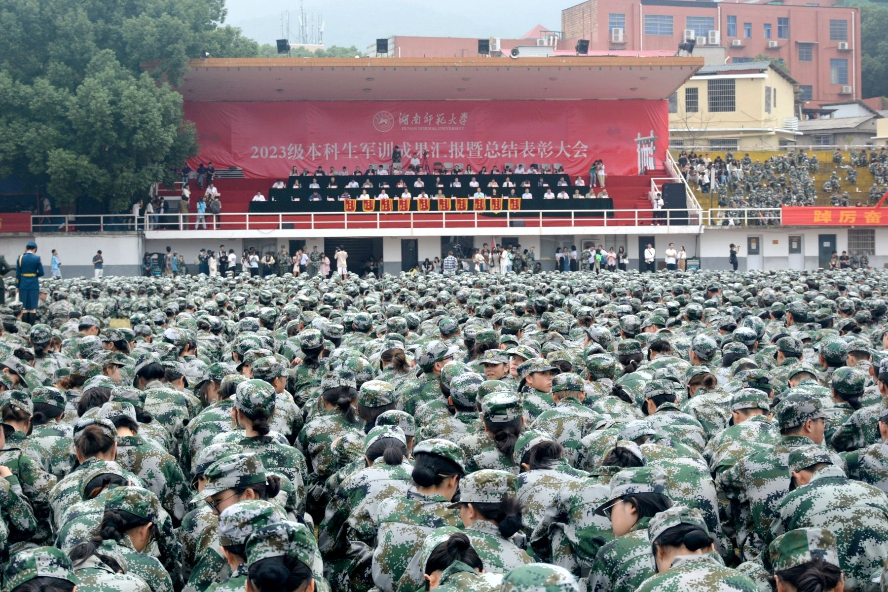 (记者 李琳 项和烽 何顺福)9月28日上午,我校2023级本科新生军训成果汇报暨总结表彰大会在二里半校区田径场举行,来自22个学院的同学们身着军装,神采奕奕,接受检阅。省总工会党组成员、省教育工会主席刘湘凌,省教育工会普教部副部长龙培,校党委副书记周俊武,副校长王辉,省军区、岳麓区人民武装部领导,学校各职能部门负责人,校军训工作领导小组成员及各学院负责人一同检阅了2023级本科新生军训成果。大会由学生工作部、武装部部长向发意主持。