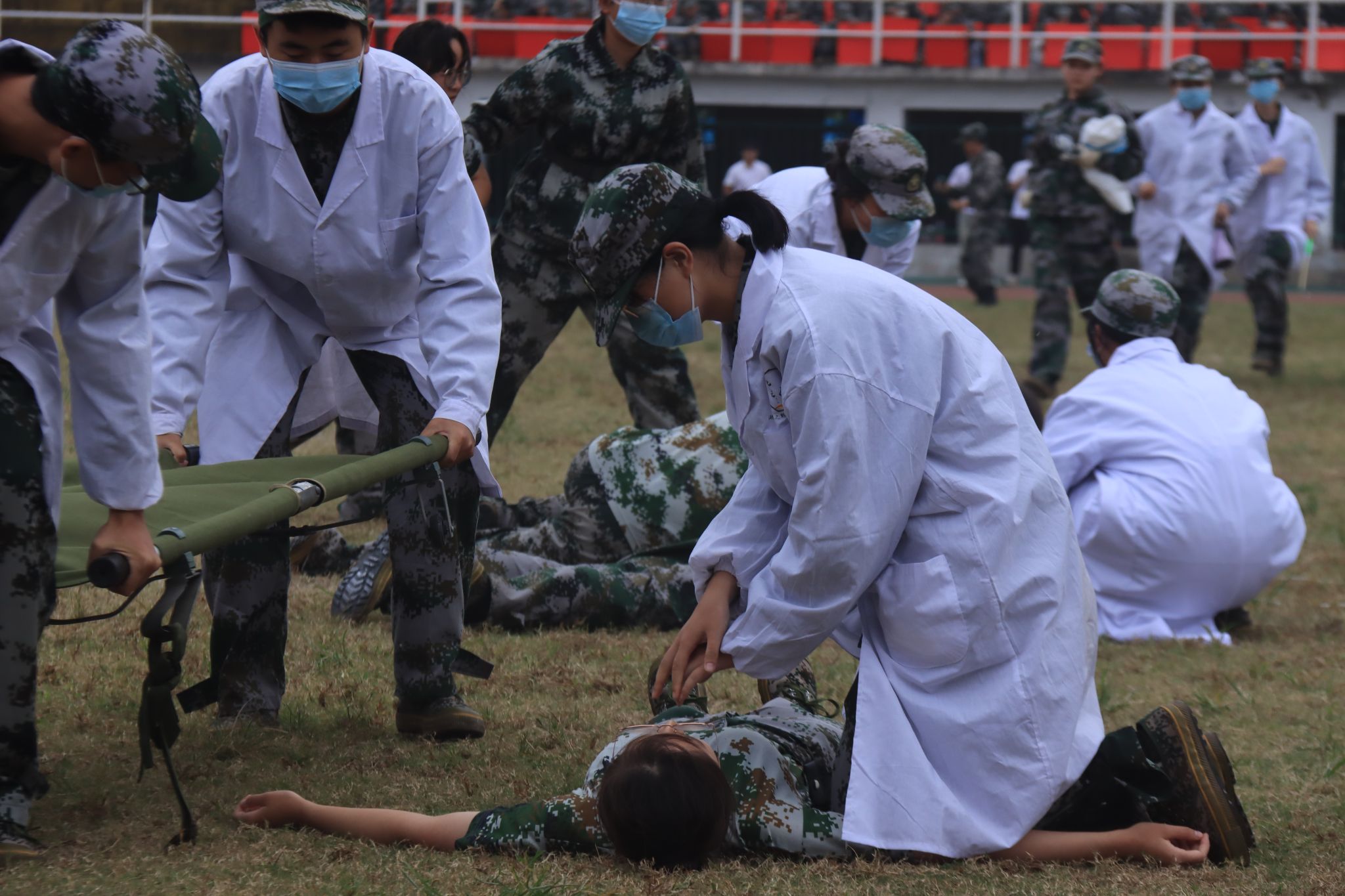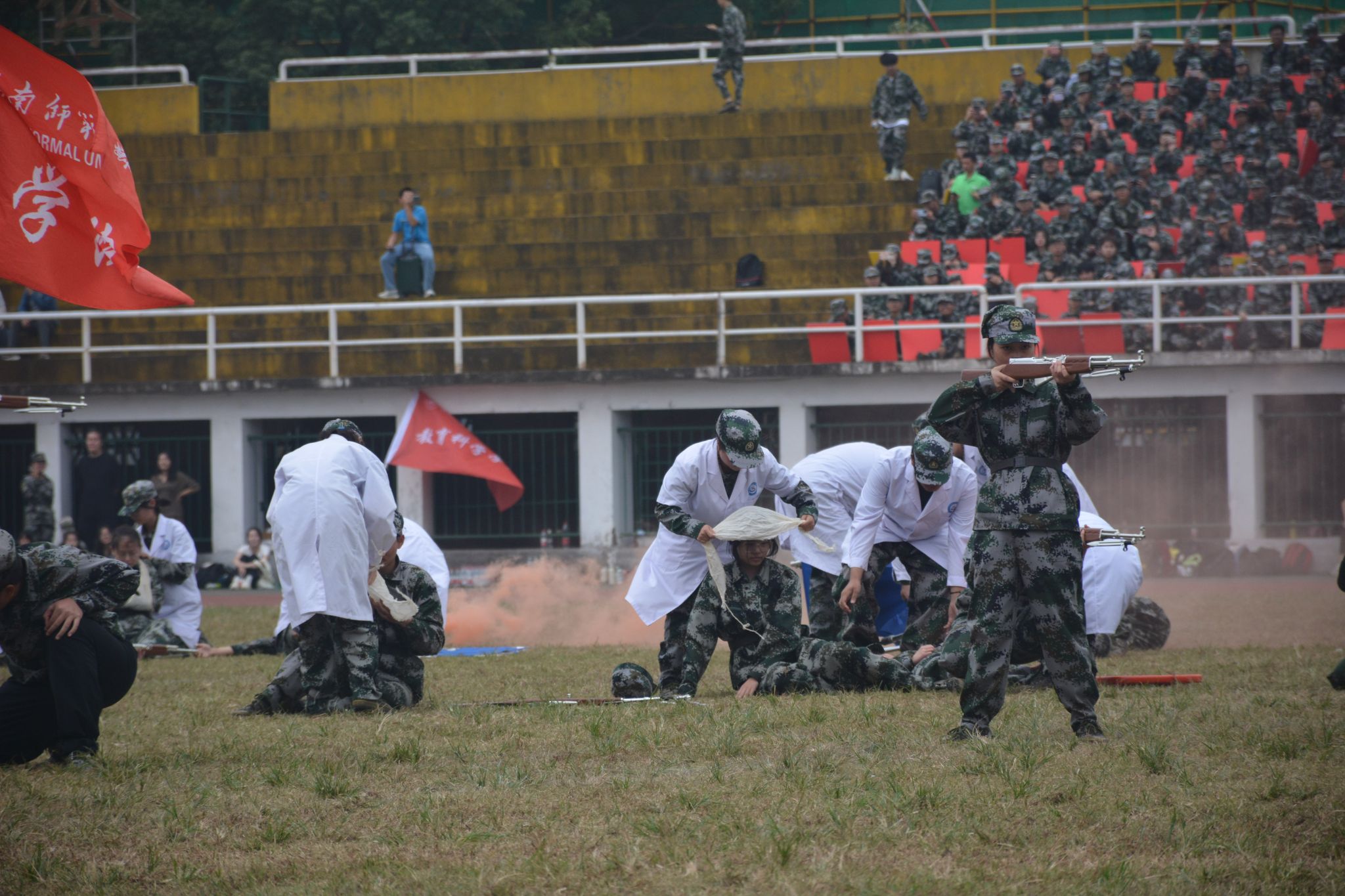 医学院带来战场自救互救演练,他们白衣飘然,不惧子弹硝烟,奔走在前线展现了医学院学子们不惧危难、逆风而行的精神。