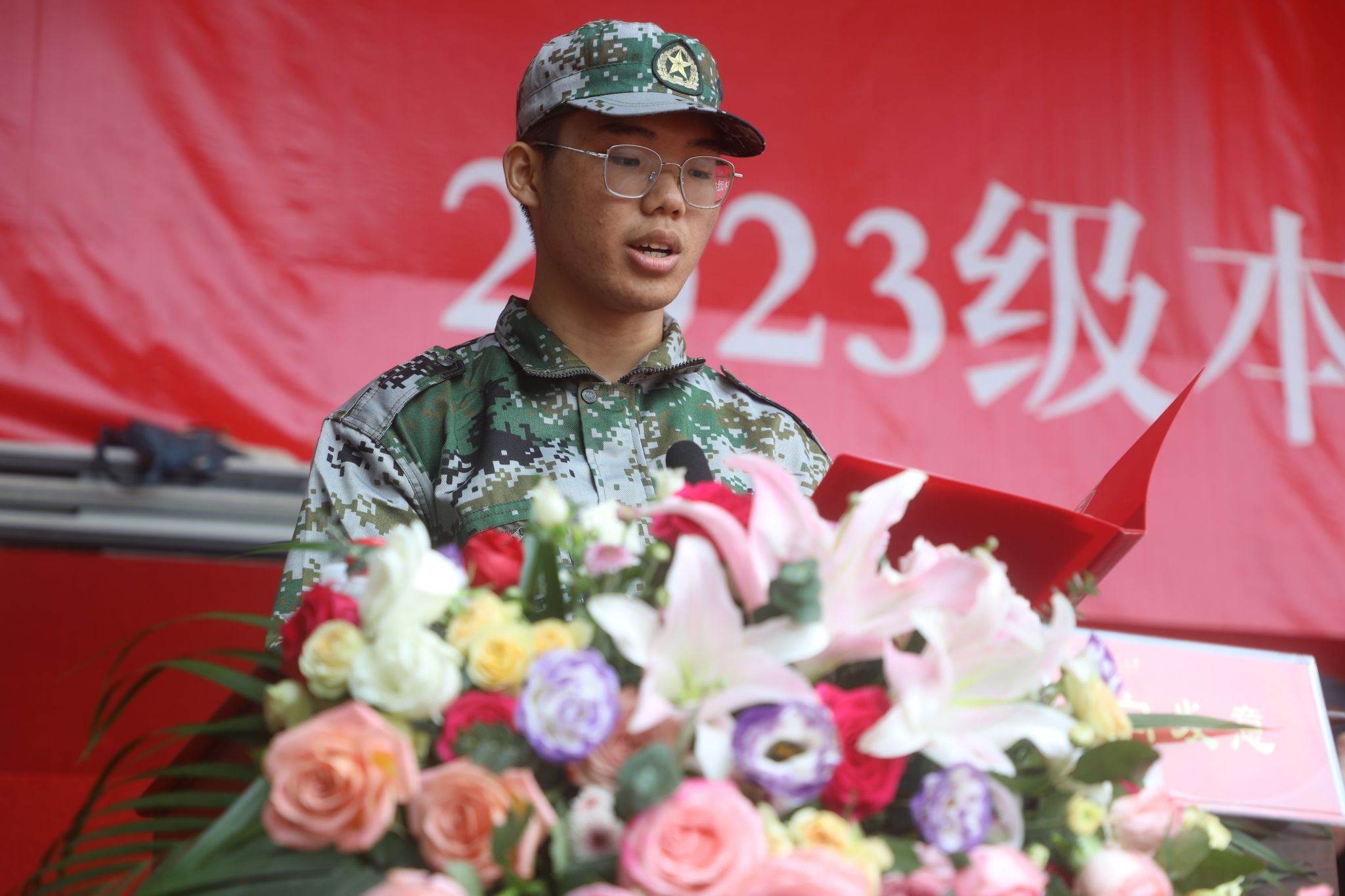 2023级本科生代表、医学院临床医学专业李凯威同学发言。他分享了军训中的心得体会,表示将以饱满的热情和昂扬的精神迎接未来的大学生活,并立志不负青春韶华,展现师大青年担当。