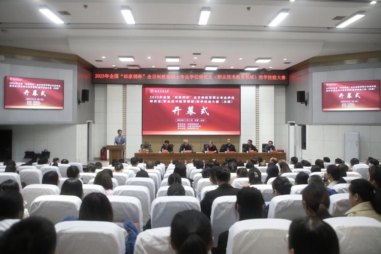 (供稿 工程与设计学院)11月11日,2023年全国“田家炳杯”全日制教育硕士专业学位研究生(职业技术教育领域)教学技能大赛(决赛)开幕式在我校举行。我校副校长蒋新苗出席开幕式。湖南省教育厅学位管理与研究生教育处处长颜胜利出席开幕式并对大赛的圆满举行表示祝贺。开幕式由我校工程与设计学院党委书记梁勇主持。