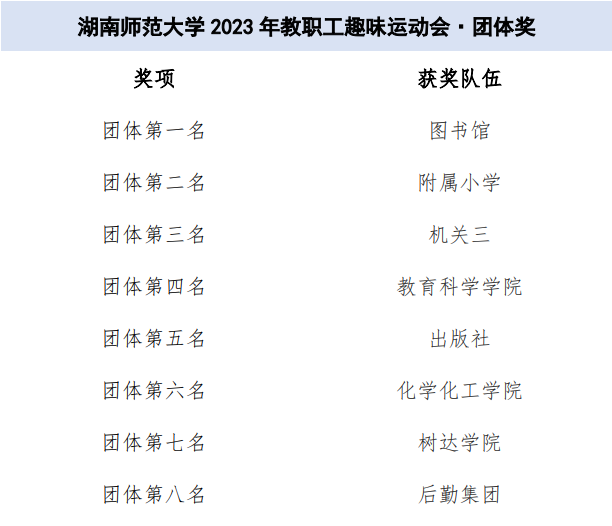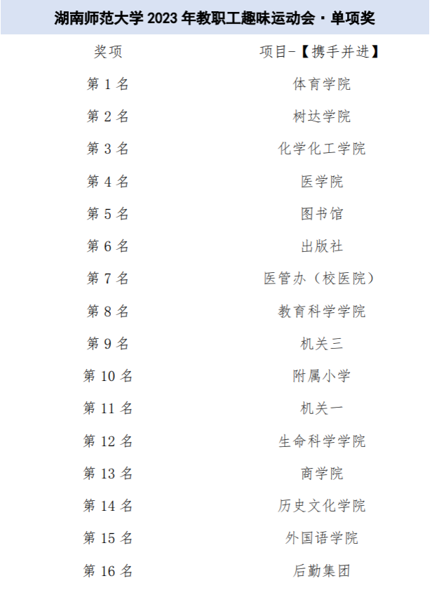 本次活动吸引了30个部门工会代表队千余名教职工踊跃参赛。比赛四个项目设单项奖1-16名,团体奖1-8名。经过激烈角逐,体育学院赢得“携手并进”项目的胜利;图书馆取得“趣味飞盘”的第一名;地理科学学院摘得“万众一心”的桂冠;教育科学学院获得“快乐一起拼”的冠军。图书馆、附属小学、机关三、教育科学学院、出版社、化学化工学院、树达学院、后勤集团获团体奖。