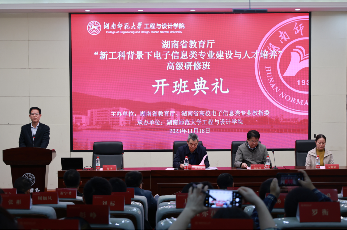 (供稿 工程与设计学院)11月18日上午,由湖南省教育厅与湖南省高校电子信息类专业教指委主办的“新工科背景下电子信息类专业建设与人才培养”高级研修班在我校顺利开班。湖南省高校电子信息类专业教指委主任委员文双春、湖南省高校电子信息类专业教指委秘书长何晓晓、我校副校长蒋新苗出席开班典礼。开班仪式由我校工程与设计学院党委书记梁勇主持。