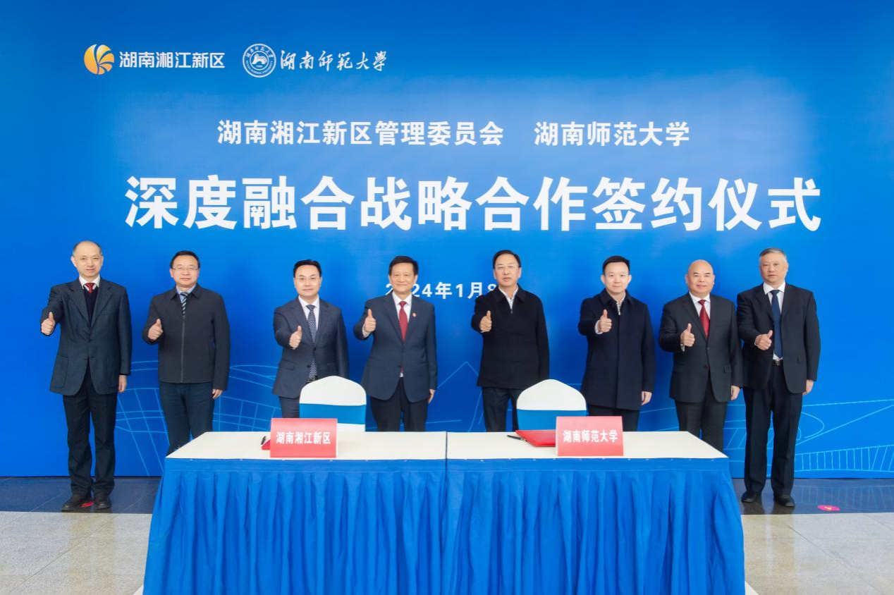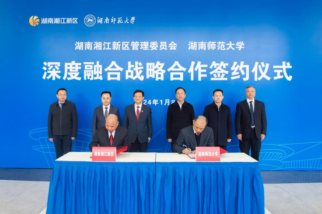 (供稿 发展规划与学科建设处)1月8日上午,我校与湖南湘江新区深度融合战略合作框架协议签署仪式在湖南湘江新区第二集中办公区举行。长沙市委副书记、湖南湘江新区(长沙高新区)党工委书记、岳麓区委书记谭勇,湖南湘江新区(长沙高新区)管委会主任、岳麓区区长何朝晖,欧洲科学院院士、校党委书记蒋洪新,第二十届中央候补委员、中国工程院院士、校长刘仲华,副校长刘怀德、杨震出席仪式。
