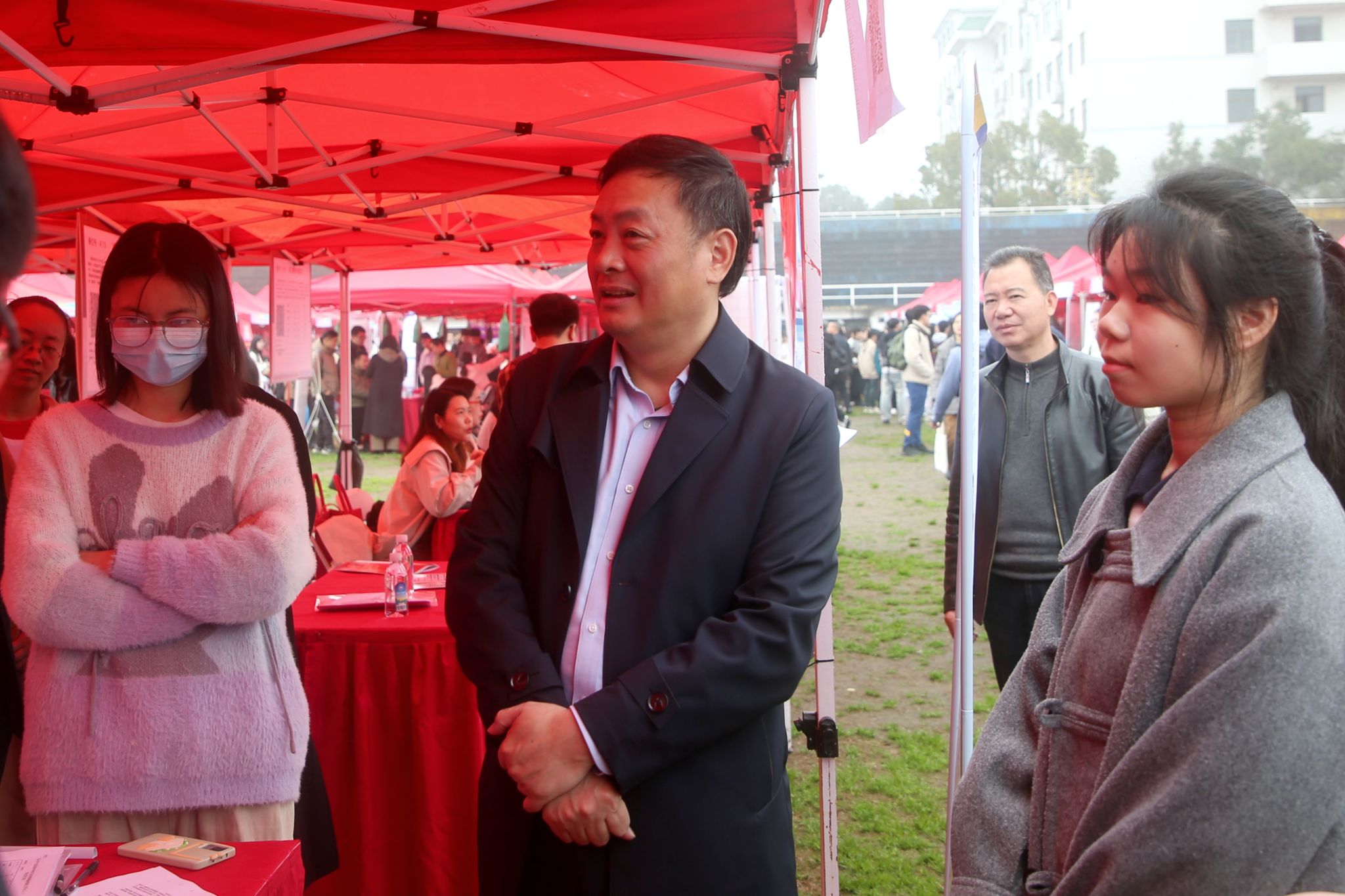 招聘会现场,王辉向各用人单位的到来表示热烈欢迎,并与招聘单位密切交流,了解用人需求、岗位要求等情况。他和现场毕业生进行交流,了解同学们的就业意向和应聘情况,关心同学们在求职中遇到的困难,鼓励大家积极与用人单位交流,充分发挥自身优势,把握机会,早日找到心仪的工作。
