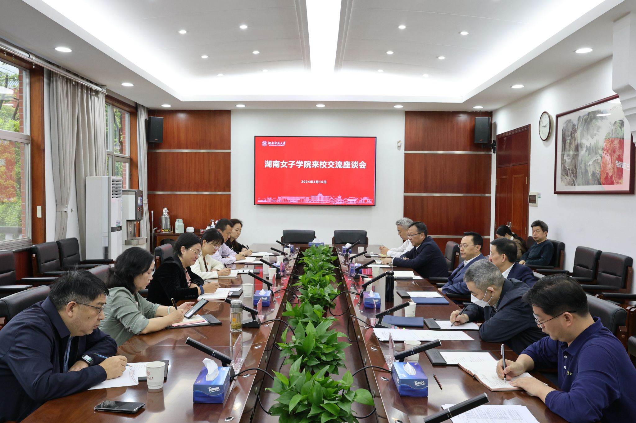 蒋洪新、刘仲华对段美娟、何旭娟一行的到来表示欢迎。他们回顾了两校的友好交流合作历史,简要介绍了我校在学科评估、人才培养、校园建设等方面取得的成绩,并就我校人才引育、产学研深度融合等方面分享经验做法。他们表示,协同育人是双方学校共同的追求和事业,两校在未来的合作交流中应当加强友好规划,促进办学合作,进行优势互补,不断拓展合作范围,深化合作层次,创新合作机制,共同推动两校事业高质量发展。