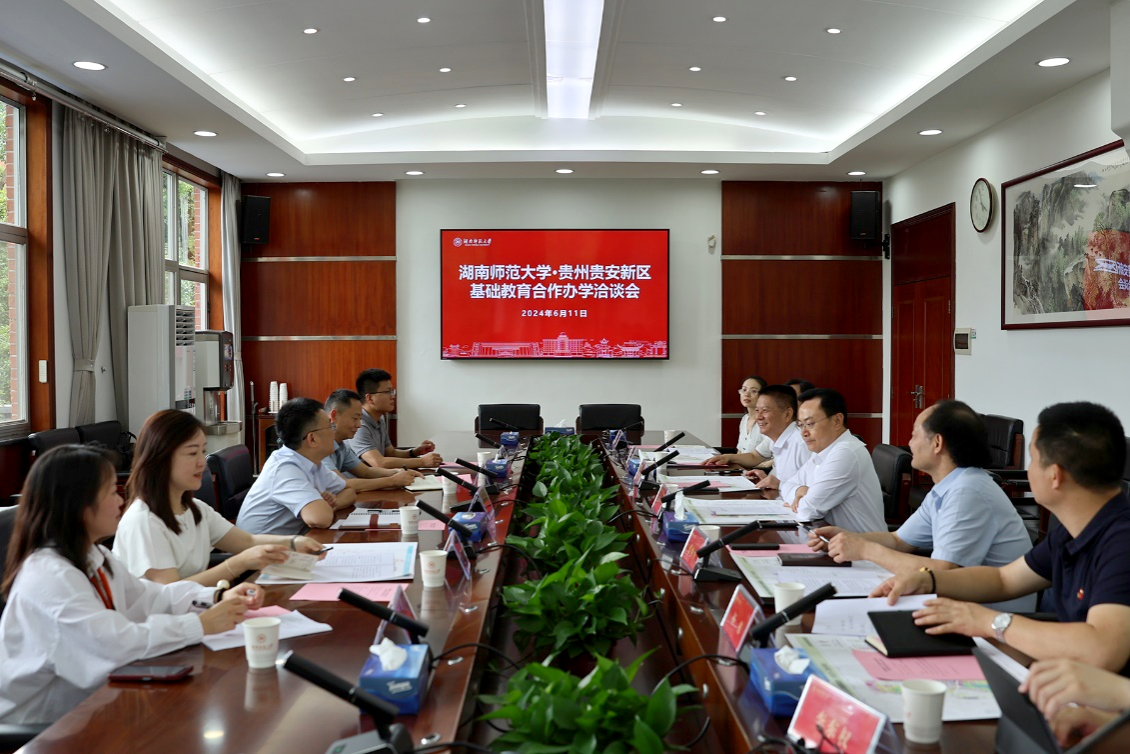 黄波对我校的热情接待表示感谢,并简要介绍了贵安新区经济社会发展与基础教育情况。他指出,贵安新区系2014年国务院批复设立的第八个国家级新区,2023年直管地区生产总值增速位居国家级新区首位,发展态势良好,产业动能强劲。他表示,我校师范教育实力雄厚,教师教育特色鲜明,办学质量高、办学成果显著,贵安新区将积极对接,寻求深度合作。同时,他希望引进我校优质教育资源,加快推动贵安新区教育优质均衡发展,助推区域基础教育扩优提质。
