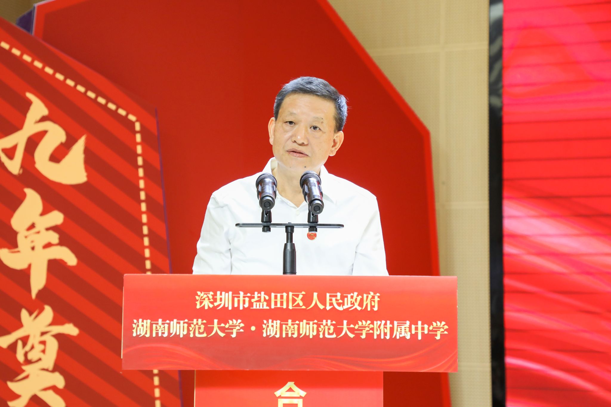 蒋洪新向盐田区及关心支持本次合作的各界人士表示感谢。他表示,我校因师而建、依师而强,主动担当作为,积极服务全国基础教育改革发展,与盐田区开展基础教育领域合作,就是勇担社会责任的生动实践。他指出,此次我校与盐田区的合作,是一次校地同频共振、相互赋能的双向奔赴。他强调,我校将以本次合作为契机,主动服务粤港澳大湾区建设等国家战略,进一步推动我校及附中与盐田区实现全方位、全天候的战略合作,进一步创新体制机制,充分释放发展活力与动能,发挥优势学科与产业的溢出效应,携手打造校地命运共同体。