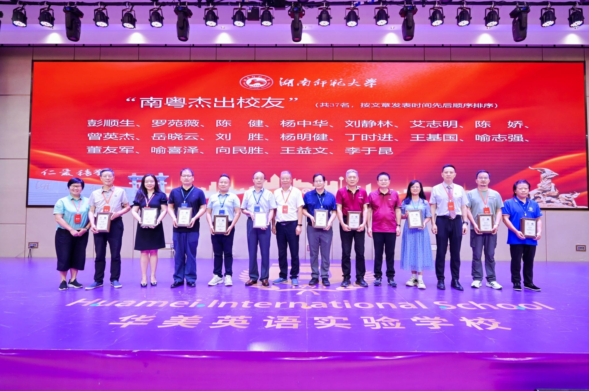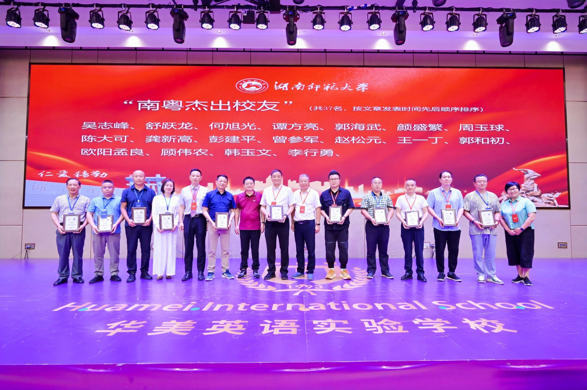 周俊武、陈峰、校友总会原秘书长杨玲和彭学文共同为荣获“南粤杰出校友”称号的校友颁发铭牌。