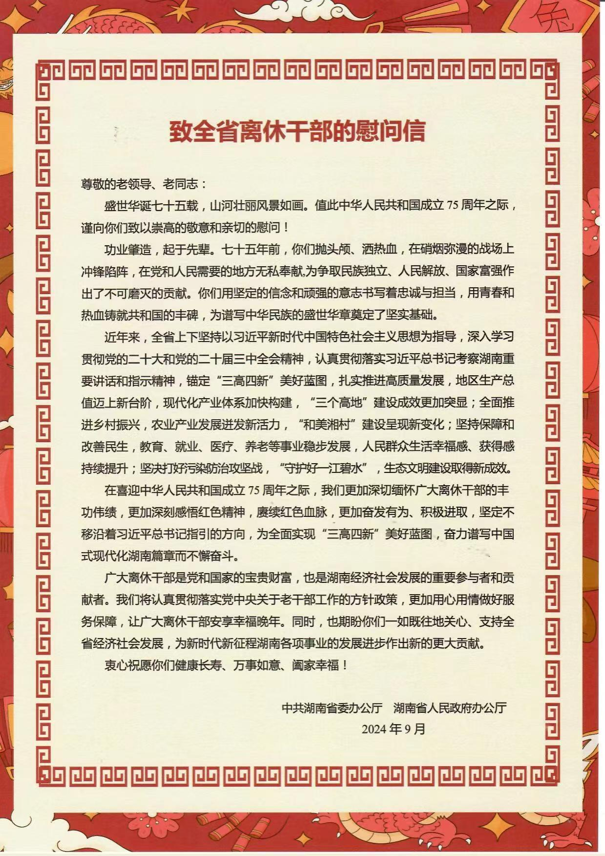 (供稿 党委组织部 离退休处)在中华人民共和国成立75周年之际,近日,校党委书记蒋洪新、校长刘仲华,校领导周俊武、姚春梅、刘怀德、唐贤清、蒋新苗、潘安练等在家校领导分别带队走访慰问老干部,转达省委省政府致全省离休干部的慰问,并代表学校党委、行政向广大老同志致以节日的问候和祝福。