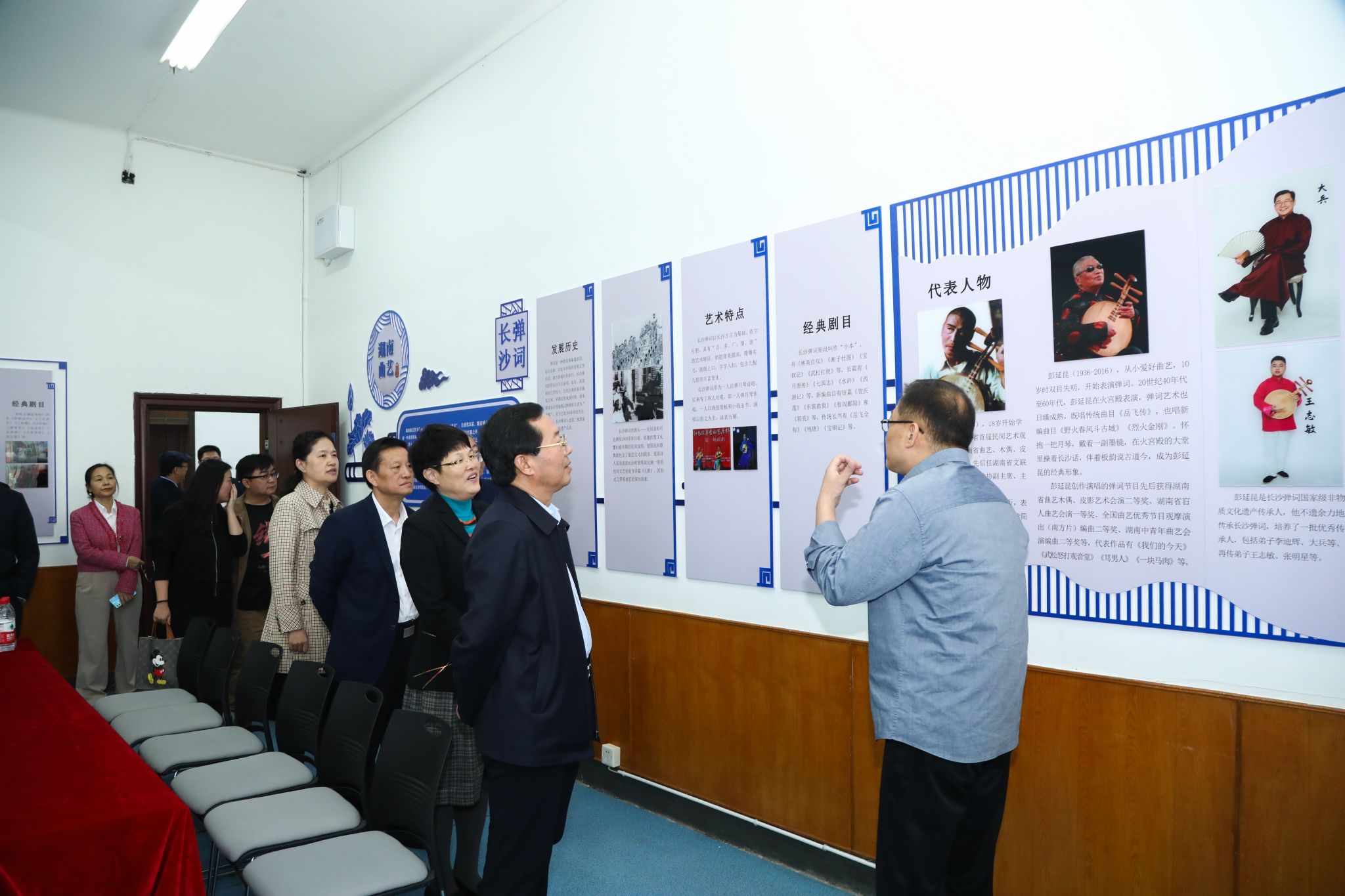 揭牌仪式前,全体嘉宾参观了曲艺文化宣传普及基地展览室,了解了入选国家非物质文化遗产保护名录的长沙弹词、常德丝弦、鼓盆歌、湖南渔鼓、祁阳小调。