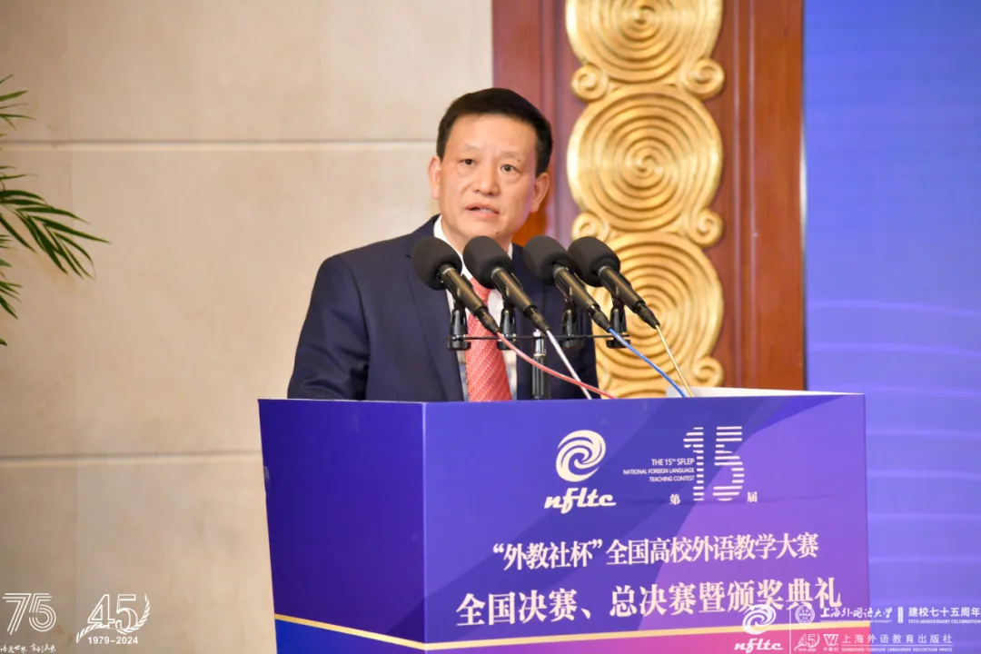 12月8日,第十五届“外教社杯”全国高校外语教学大赛全国决赛、总决赛颁奖典礼在上海举行。蒋洪新为大赛创始人颁发荣誉奖,并受邀致辞。他指出,“外教社杯”全国高校外语教学大赛作为我国最早举办的大学外语教学比赛,也是规模最大、范围最广的比赛之一,是外语界的一项盛事。自第三届起,增设了外语类专业组比赛,不仅为外语教师提供了一个展示专业水准和交流经验的平台,也为外语教学领域注入了新的活力,让我们看到了外语教育蓬勃的后生力量。大赛在竞技、交流的同时,为外语人才的培养和学科发展做出了有益的探索:一是不断激活学科建设的内驱力;二是持续推进外语教育教学改革;三是深入探索新技术的跨界应用。站在崭新历史起点上,外语教育事业的舞台空前广阔,希望大家在服务国家重大战略中,为共同的外语事业开创更加美好的未来。