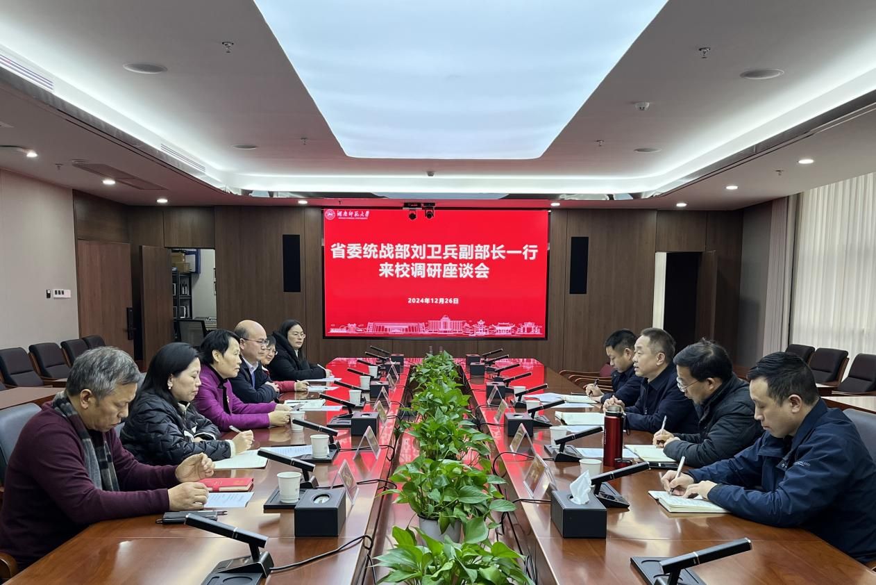 (供稿 党委统战部)12月26日下午,省委统战部副部长刘卫兵一行来校调研。调研座谈会在三棵树科研楼四楼会议室举行。副校长谢资清出席会议,会议由校党委委员、统战部部长杨念主持。