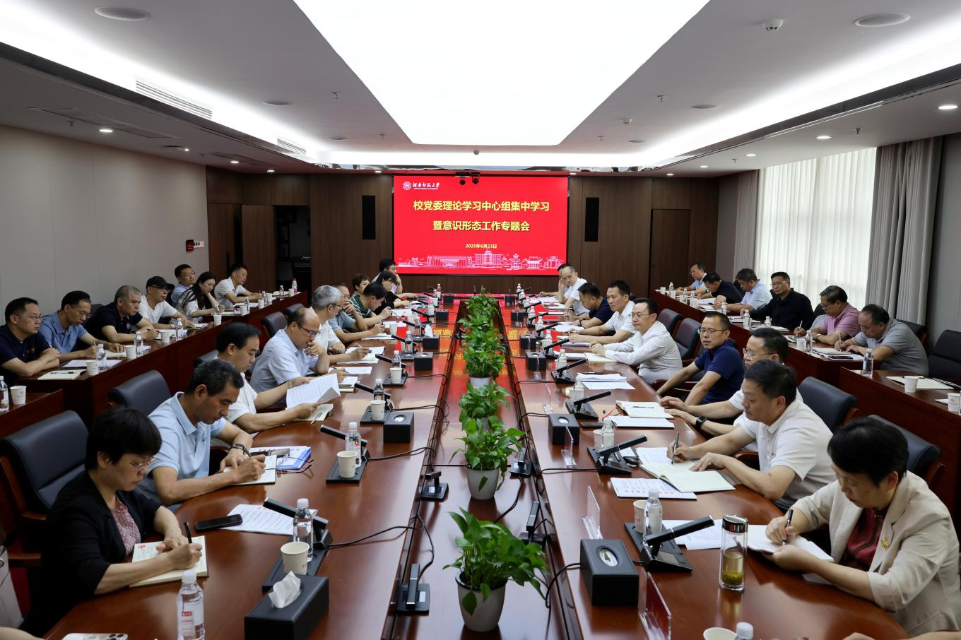 (记者 吴乐 马铁泉 黄依依)6月23日下午,学校在三棵树广场教学科研综合楼四楼会议室,召开校党委理论学习中心组学习会暨意识形态工作专题会,深入学习贯彻习近平总书记关于意识形态工作的重要论述,研究部署学校意识形态工作。省委教育工委委员、省教育厅党组成员余伟良,省委教育工委宣传部部长、省教育厅思政处处长许抗来校巡听指导。校党委副书记、校长刘仲华主持会议。全体在家校领导、党委委员,学校意识形态领域情况分析研判小组成员单位主要负责人,各二级党组织书记参加学习。