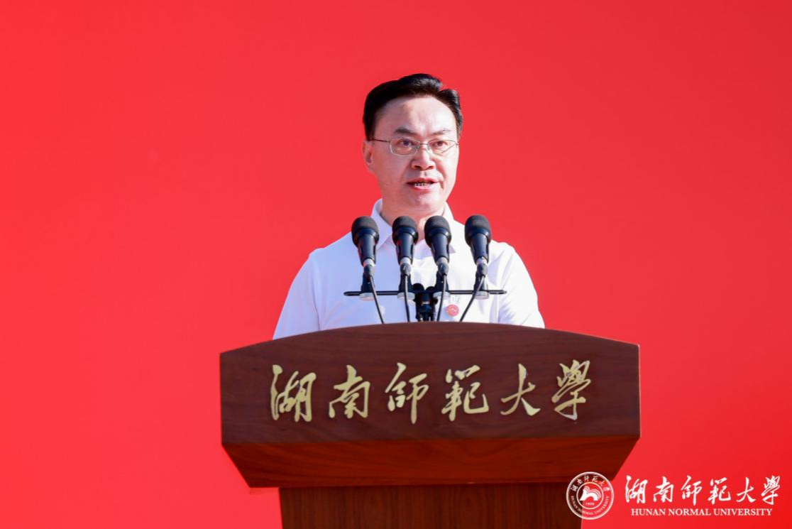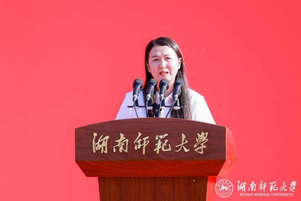 2025年湖南省最美教师、马克思主义学院教授邓验作为教师代表发言。她回顾缘系师大的14年成长路,鼓励同学们以理想为灯照亮前路、以创新为翼搏击长空、以坚韧为盾直面挑战、以团结为桥连接未来,奋力奔跑、勇敢逐梦,成长为有理想、敢担当、能吃苦、肯奋斗的新时代好青年!
