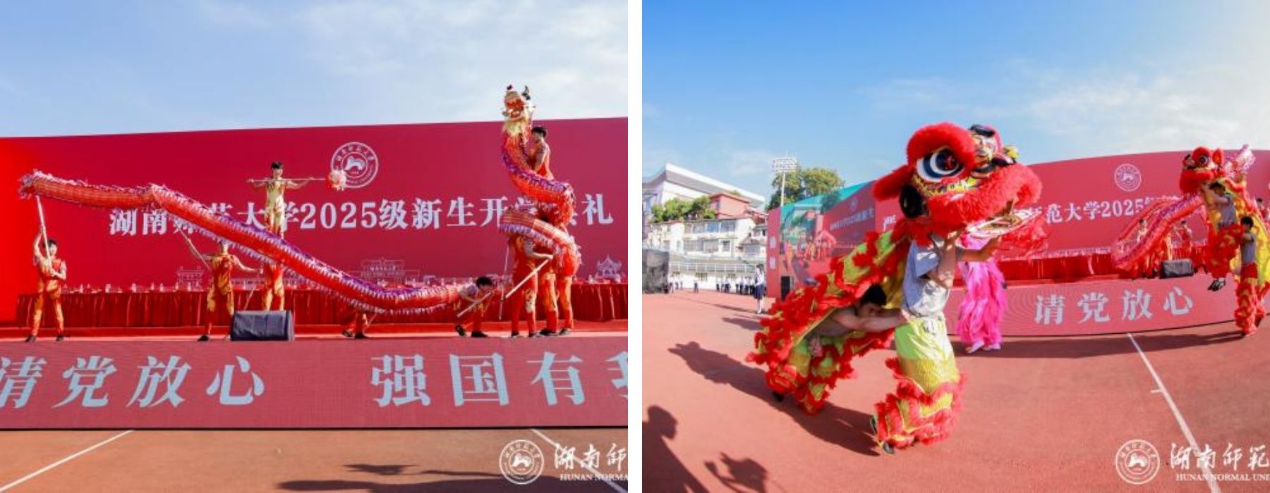 典礼开始前,体育学院和音乐学院的学生代表献上了《第一天》《篇章》《光芒》《祥龙瑞狮迎骄子》等精彩节目,以青春歌舞和传统瑞狮迎接新生入学,现场气氛热烈昂扬。