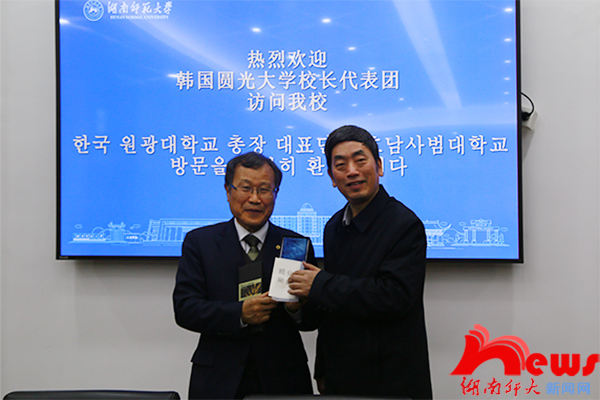 (记者 皮楚粤 赵航航)12月11日下午,韩国圆光大学校长朴孟洙一行访问我校,欢迎仪式在校办公楼二会议室举行,副校长黎大志出席仪式,仪式由国际交流合作处副处长李苗主持。
