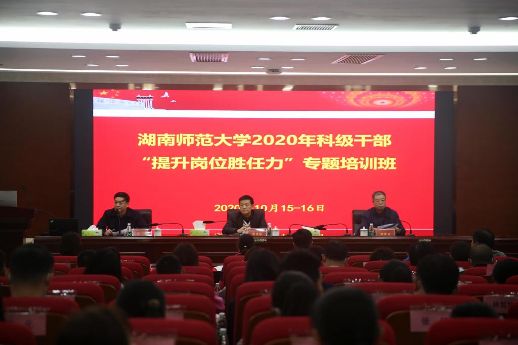 (记者 马铁泉 鲍娟娟 实习记者 苏拉)10月15—16日,学校在中和楼342报告厅举办2020年科级干部“提升岗位胜任力”专题培训班。校党委书记蒋洪新、校长刘起军为培训班授课。课前,举办了简短的开班式,蒋洪新书记出席,周俊武副校长发表讲话,校党委委员、党委组织部部长王辉主持。